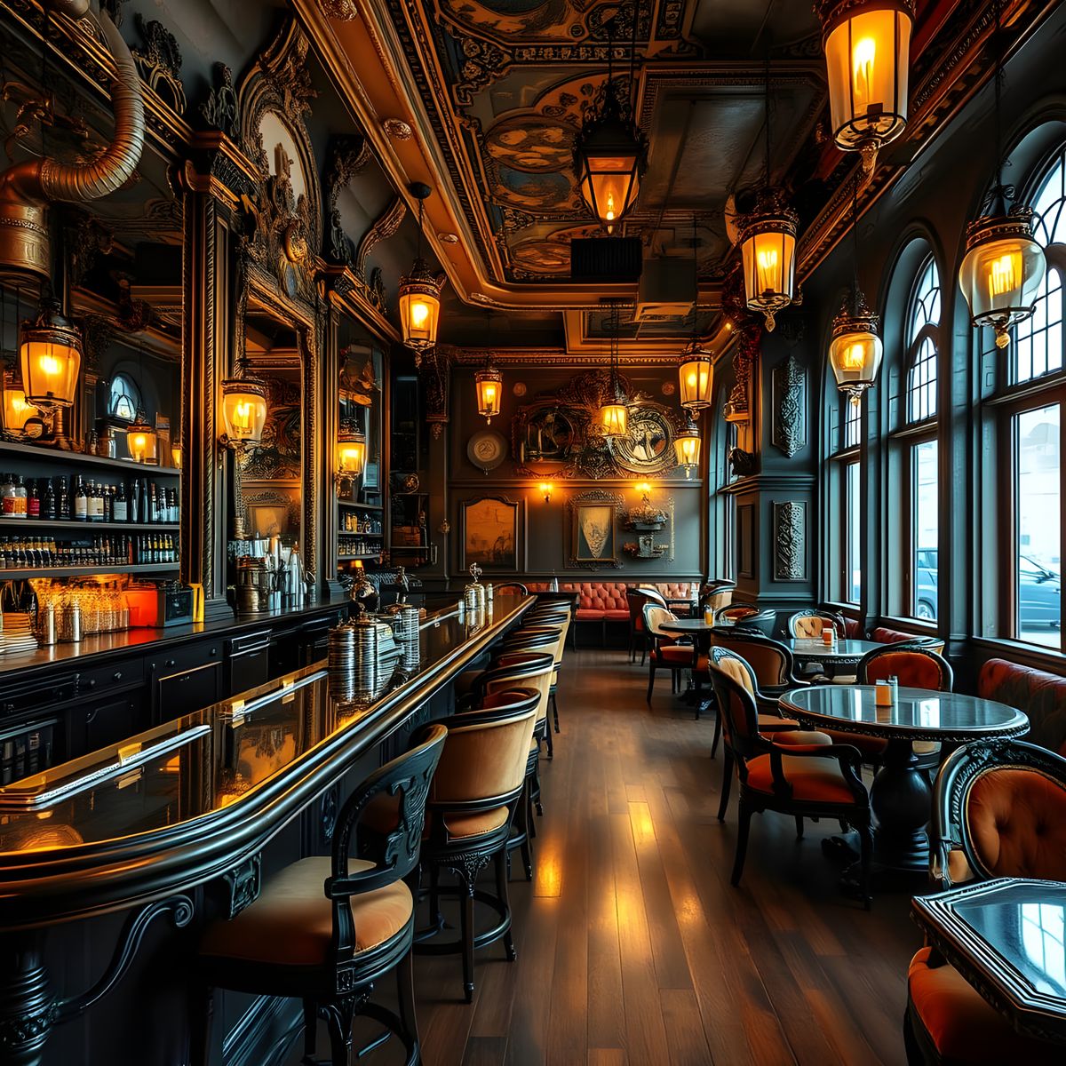 This image shows a beautifully designed steampunk cafe with intricate wood floors, a long bar, and luxurious rose-gold velvet furniture, set against a backdrop of vintage European charm