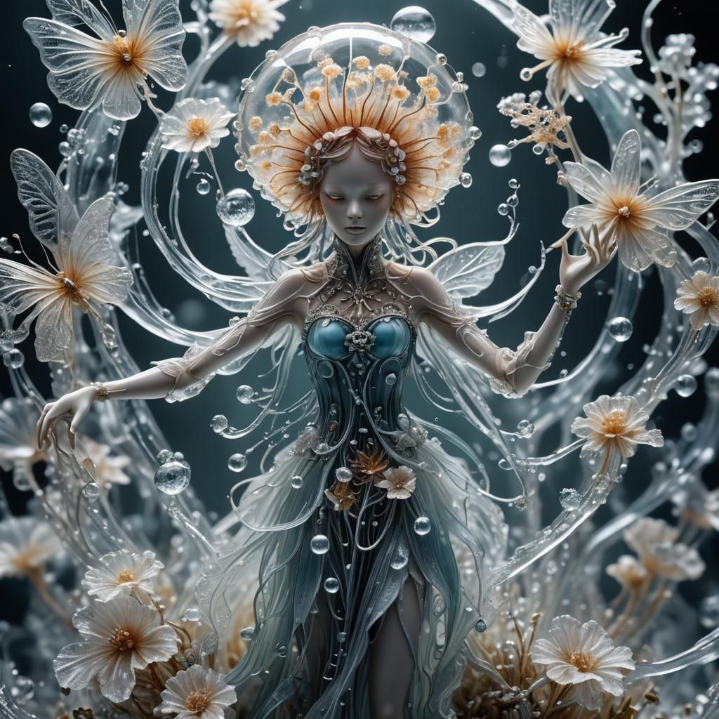 A hyperrealistic image of a jellyfish sculpture with flower and butterfly elements. The fantasy art is highly detailed and uses natural lighting to create a moody, atmospheric effect.