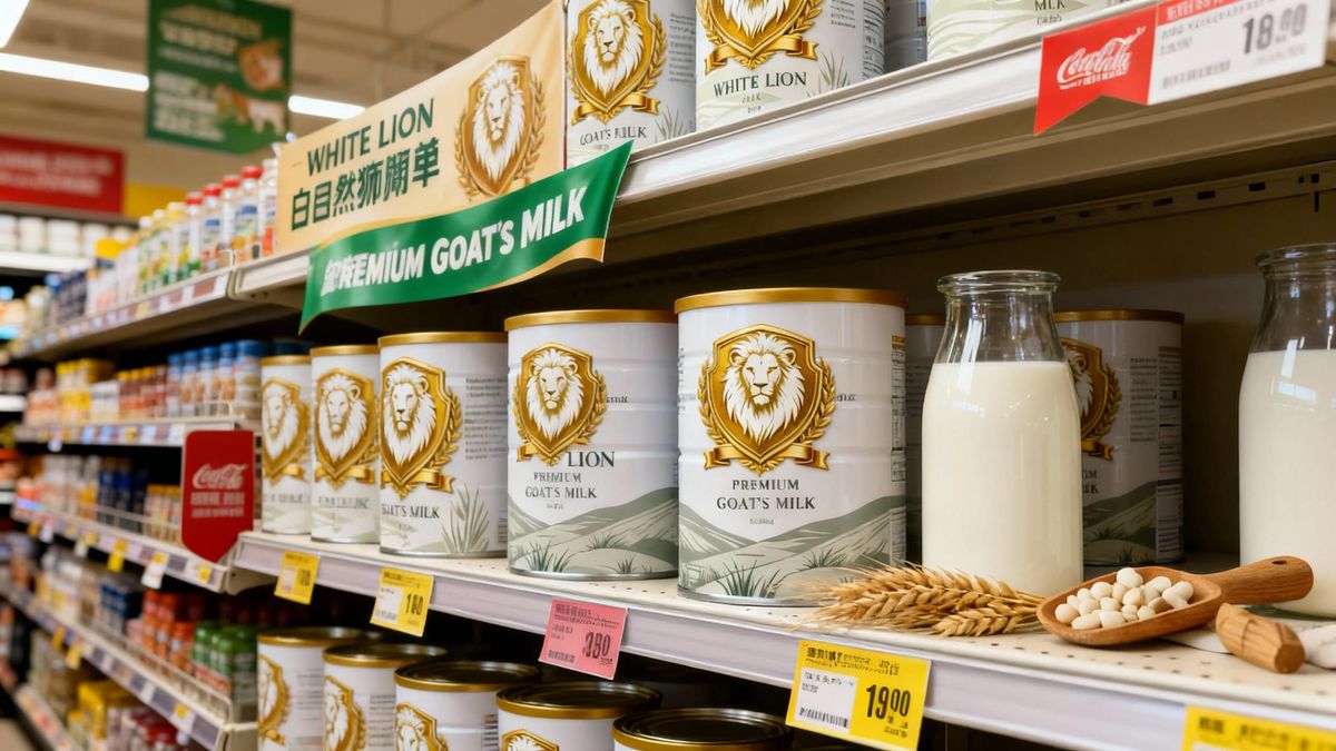 This image depicts supermarket shelves stocked for the exciting product launch of White Lion premium goat's milk, highlighting a new dairy offering.