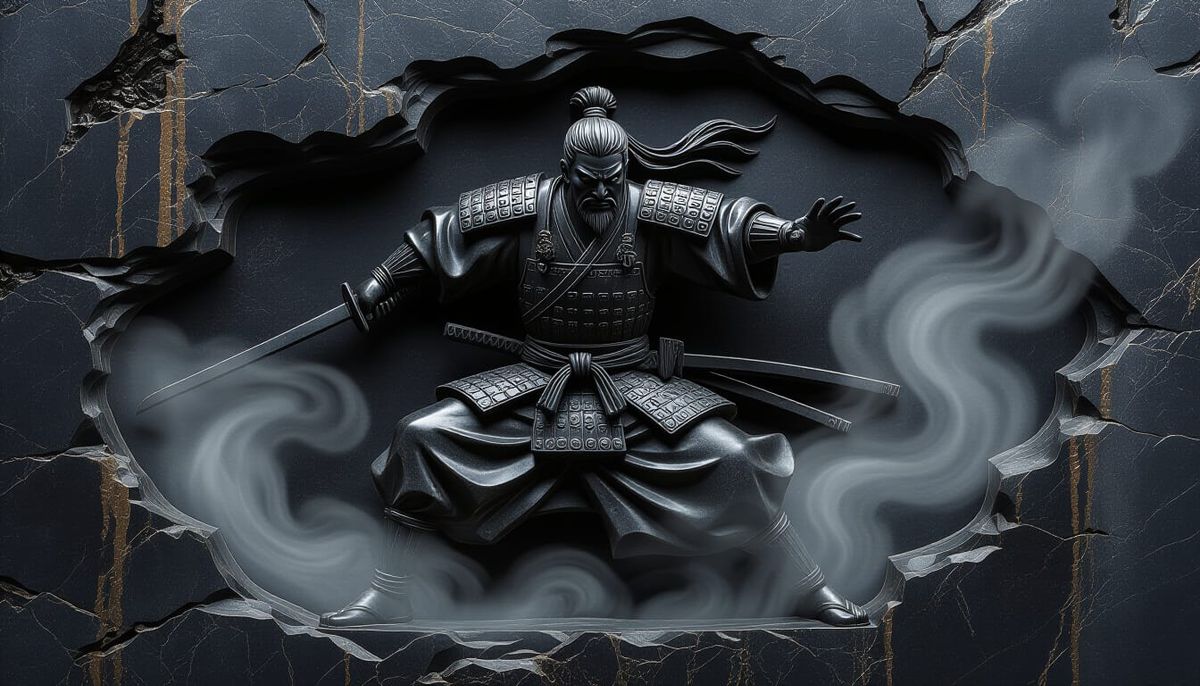 This image shows a powerful ronin warrior carved in bas-relief. The black onyx stone carving features deep, dramatic textures and an ethereal mist, rendered in a red and black color scheme.