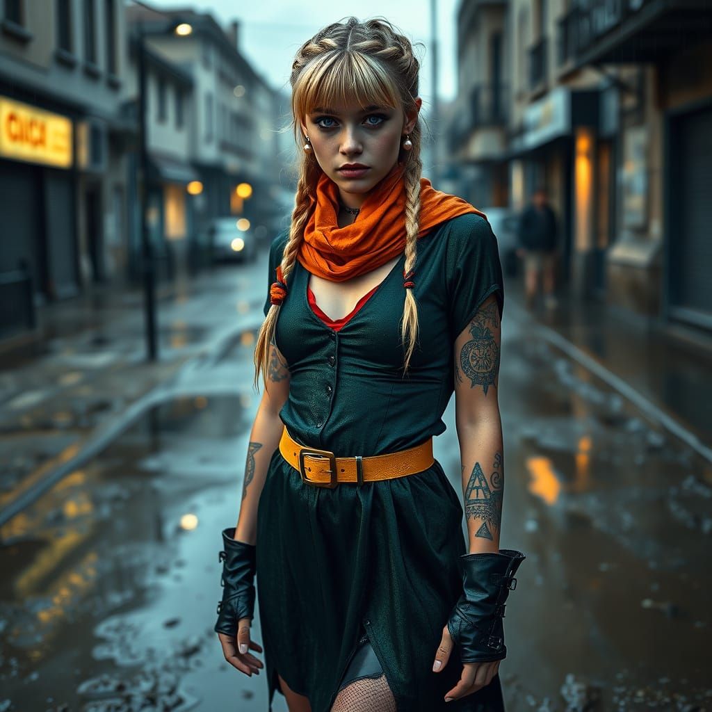 This image shows a defiant blonde teenage girl standing on a wet, muddy dystopian street. She has tribal tattoos, an orange scarf, and a dark green dress. The picture is highly detailed.