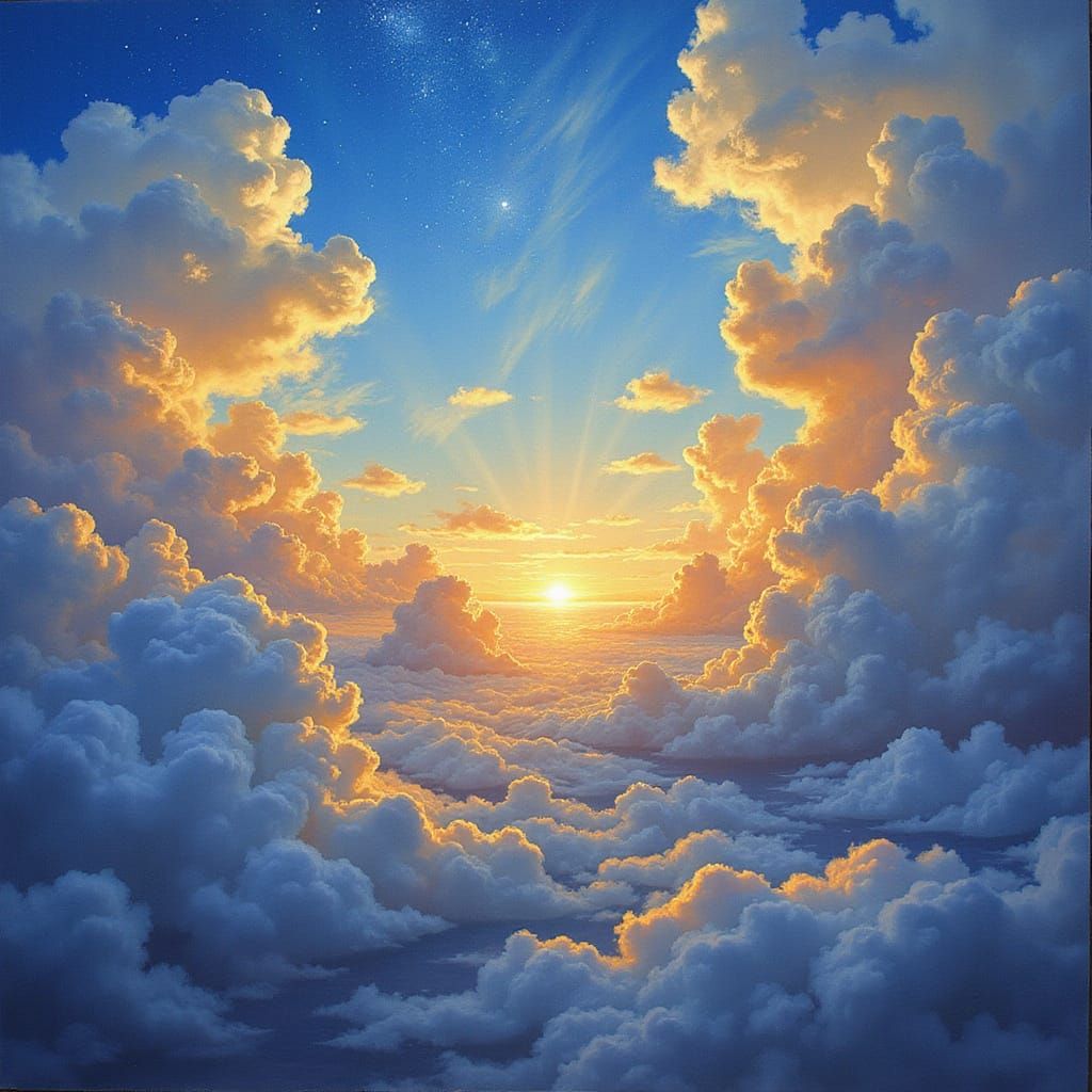 This breathtaking oil painting depicts a vibrant heaven with majestic clouds, heroic sunbeams, and beautiful celestial formations, rendered in a style reminiscent of Impressionism and Magical Realism with deep blues and rich golds