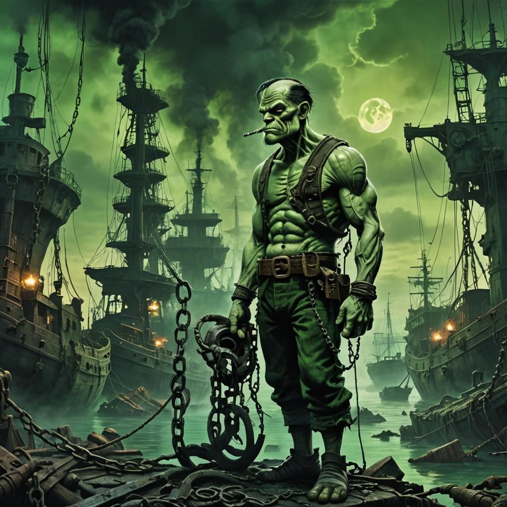 This image shows Popeye in a dark, post-apocalyptic harbor filled with rusted ships. The horror-inspired scene features twisted metal, sharp shadows, and a hellish green glow, reminiscent of H.R. Giger's artwork.