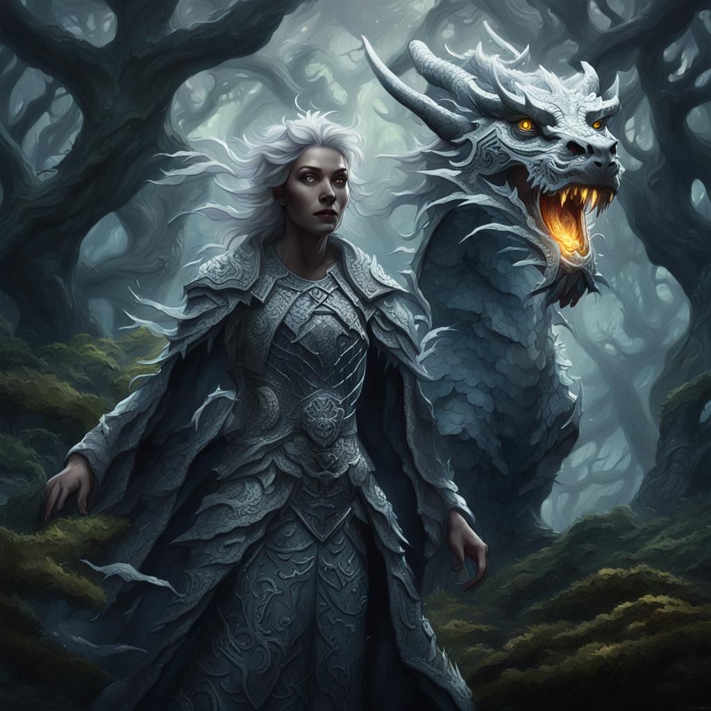 This image shows a silver dragonborn druid conjuring a storm in a magical forest. The scene features intricate organic patterns and art nouveau aesthetics, with dynamic lighting and rich purple and yellow hues.