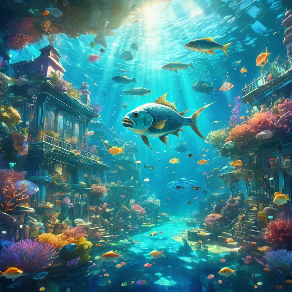 A striking picture of an anime-style underwater city filled with fish people. The vibrant digital art features shimmering kelp and iridescent scales, lit by sun rays and oceanic hues.