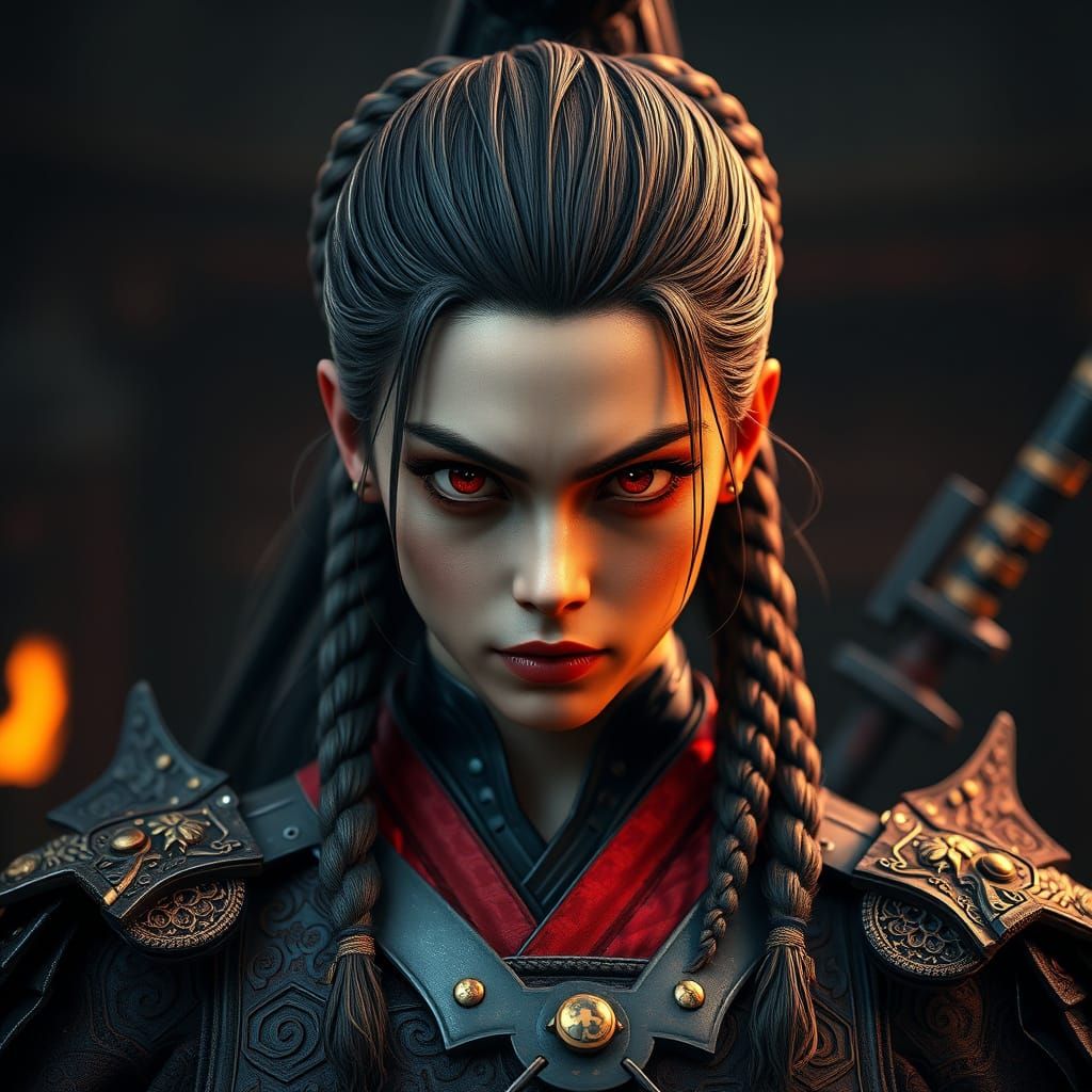 This striking image showcases a powerful samurai woman with braided hair and blazing red eyes, clad in intricate armor, set against a dramatic backdrop of dynamic lighting, rendered in 8K with meticulous detail, evoking the cinematic styles of Unreal Engine 5 and CryEngine.
