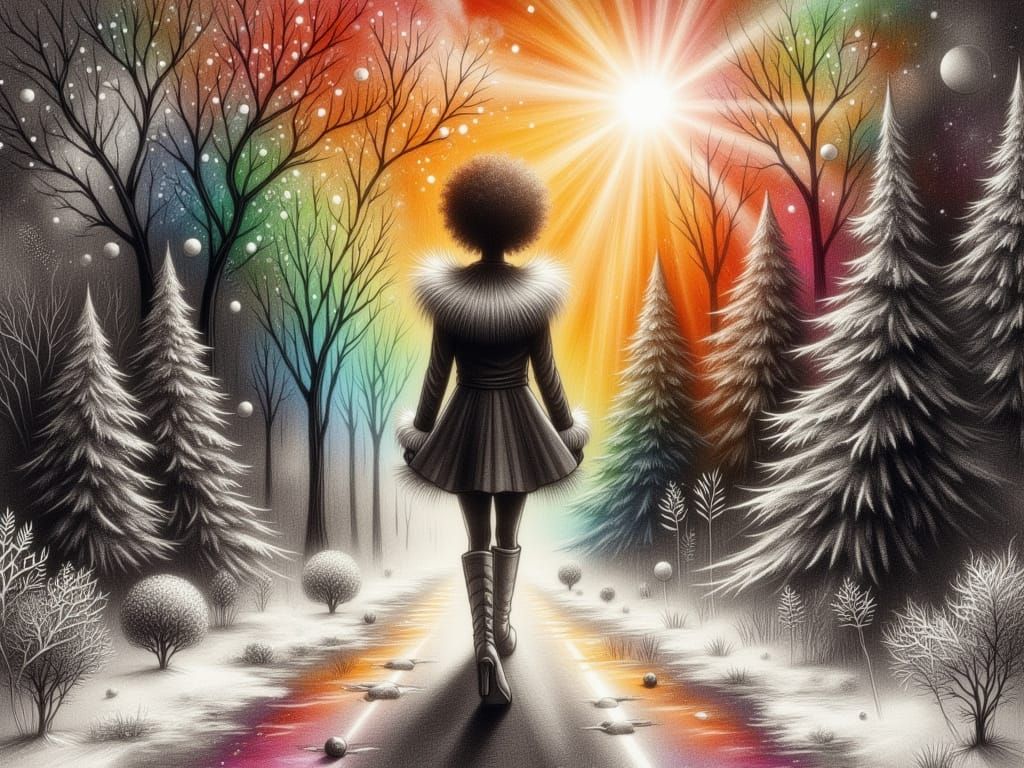 This image shows a Black woman walking a snowy forest path. The serene scene features fir trees and trees with red, green and white leaves, rendered with vibrant colors and whimsical details.