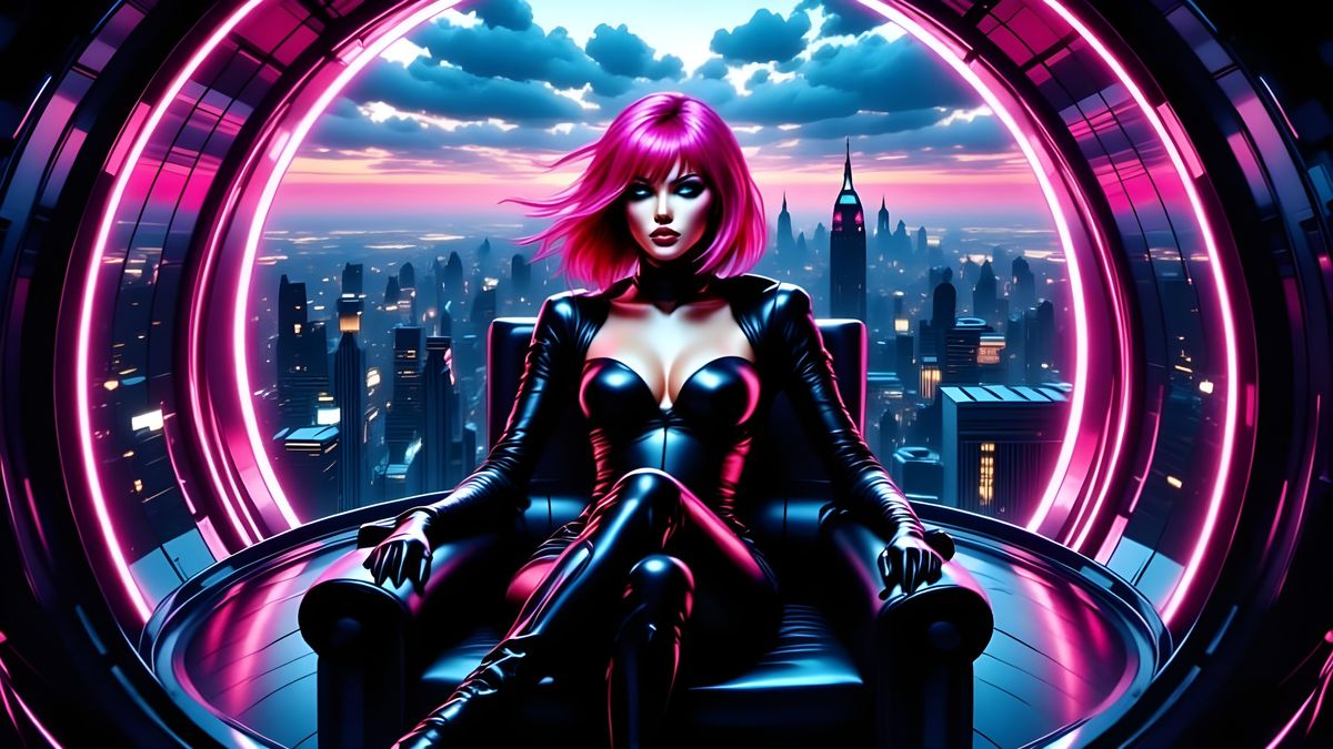 This image shows a cyberpunk queen seated on a throne in a penthouse suite. The image blends hyper-realistic and photorealistic styles with vibrant colors and futuristic aesthetics, reminiscent of digital art.