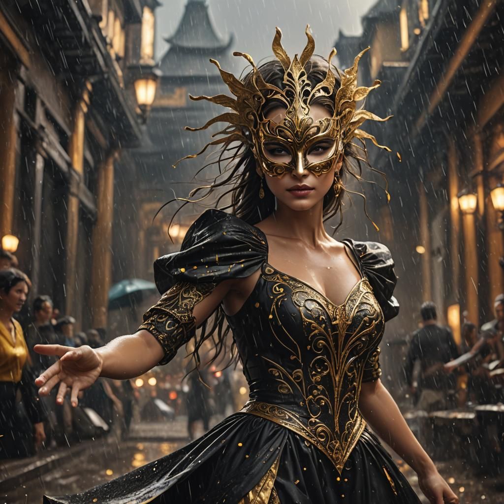 This image shows a gorgeous woman in a black and gold dress at her last dance in the rain. The digital painting features intricate details and complementary colors in an unreal engine art style.