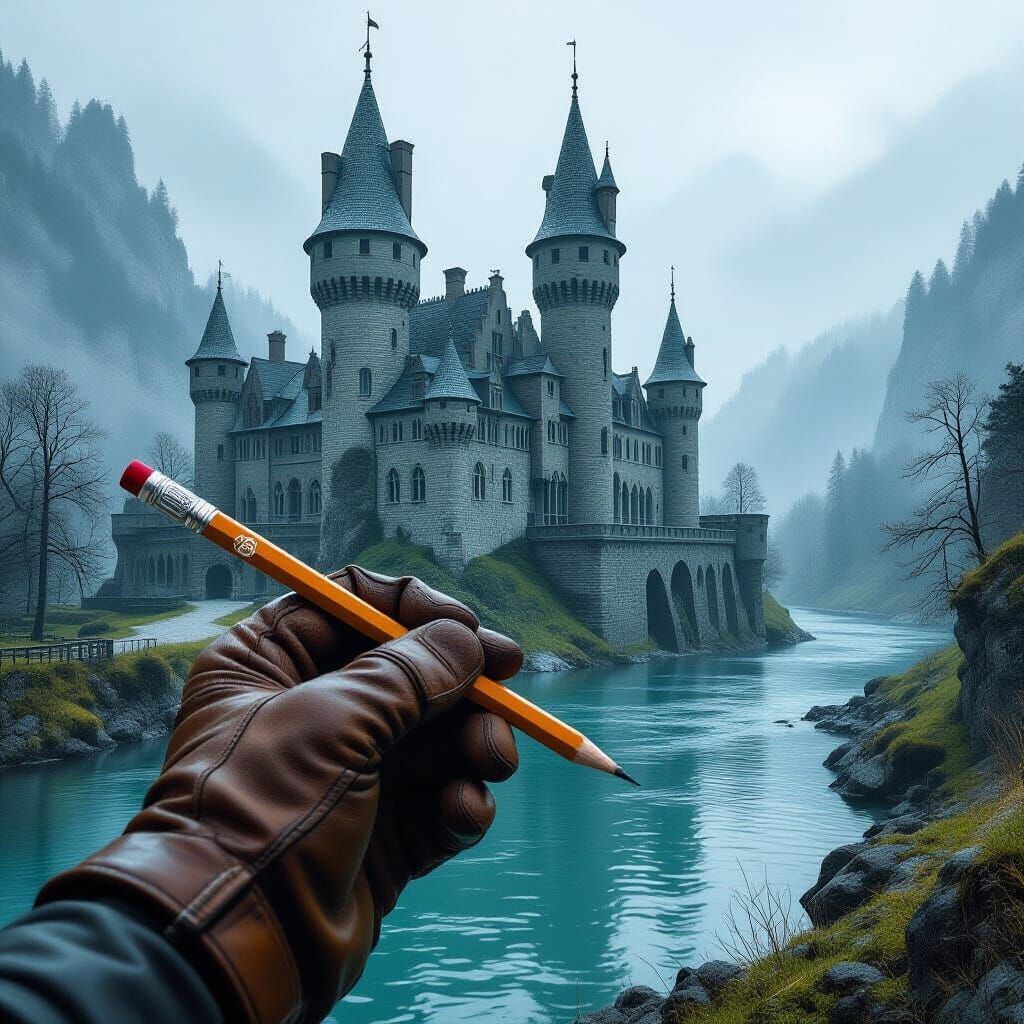 This image shows a hand drawing a majestic ancient castle next to a river. The image has intricate details and moody atmospheric lighting, reminiscent of retro-futuristic concept art.