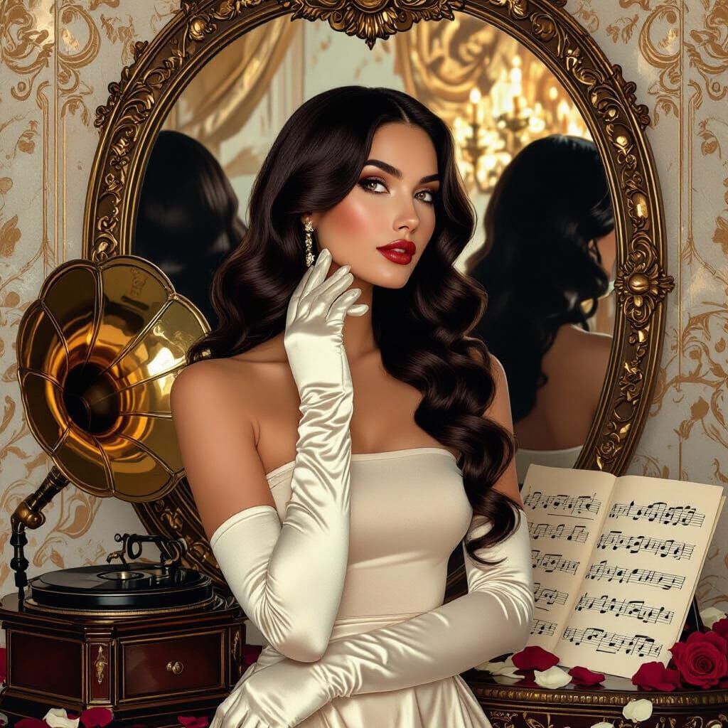 A beautiful brunette with dark vintage waves stands before an Art Deco mirror. Soft golden light illuminates the scene, featuring musical notes and rose petals in a richly detailed, romantic style.