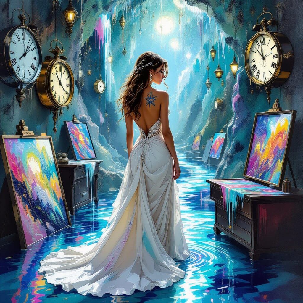 This image shows a woman with a constellation tattoo in a surreal studio. Melting clocks and vibrant paintings fill the space, illuminated by neon lights and watercolor shadows in a neo-impressionist style.