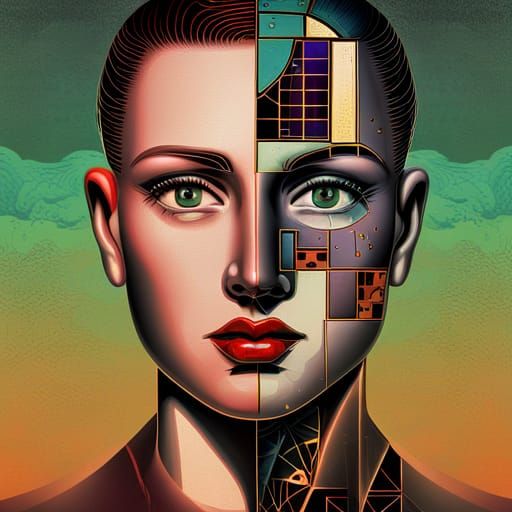 A screen-printed face of a cyborg in vintage pop art style. The digital artwork features triadic colors, an 8k resolution, and geometric Bauhaus design elements.