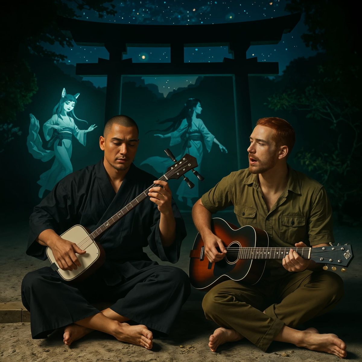 A striking photo of a samurai playing shamisen and an explorer playing guitar in a zen garden. Features Kitsune and Futakuchi-ona dancing under neon lights, with a star-filled sky and torii gate.