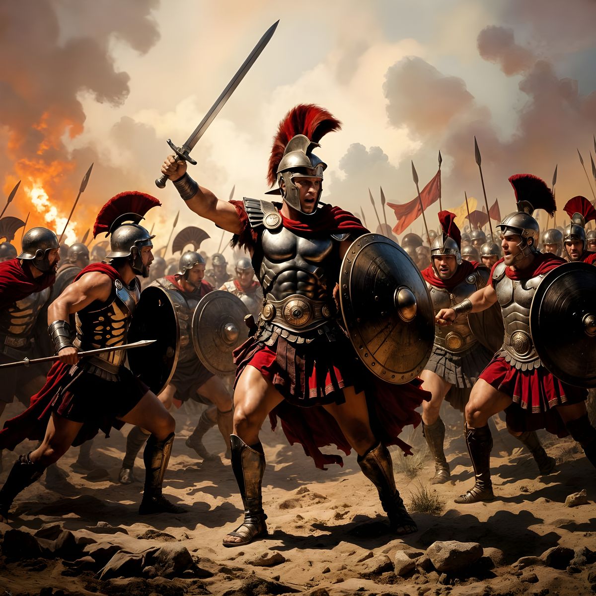 This image depicts Spartacus leading a fierce and epic battle against Roman forces. A dramatic scene of conflict and heroism.