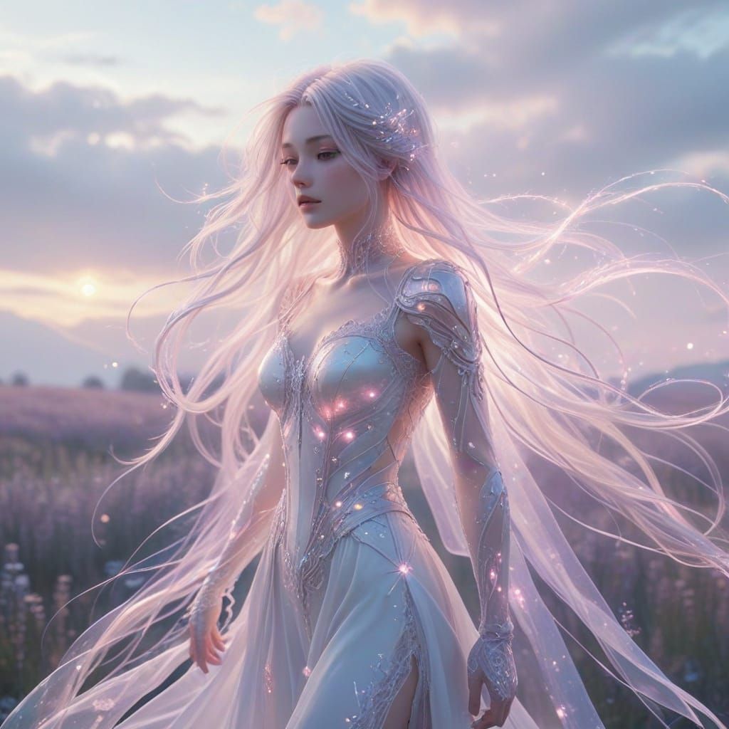 This image shows a beautiful cyborg woman with long hair in a pastel-colored, ethereal style. She stands in a field, seemingly experiencing the world for the first time, with a dreamy, anime aesthetic.