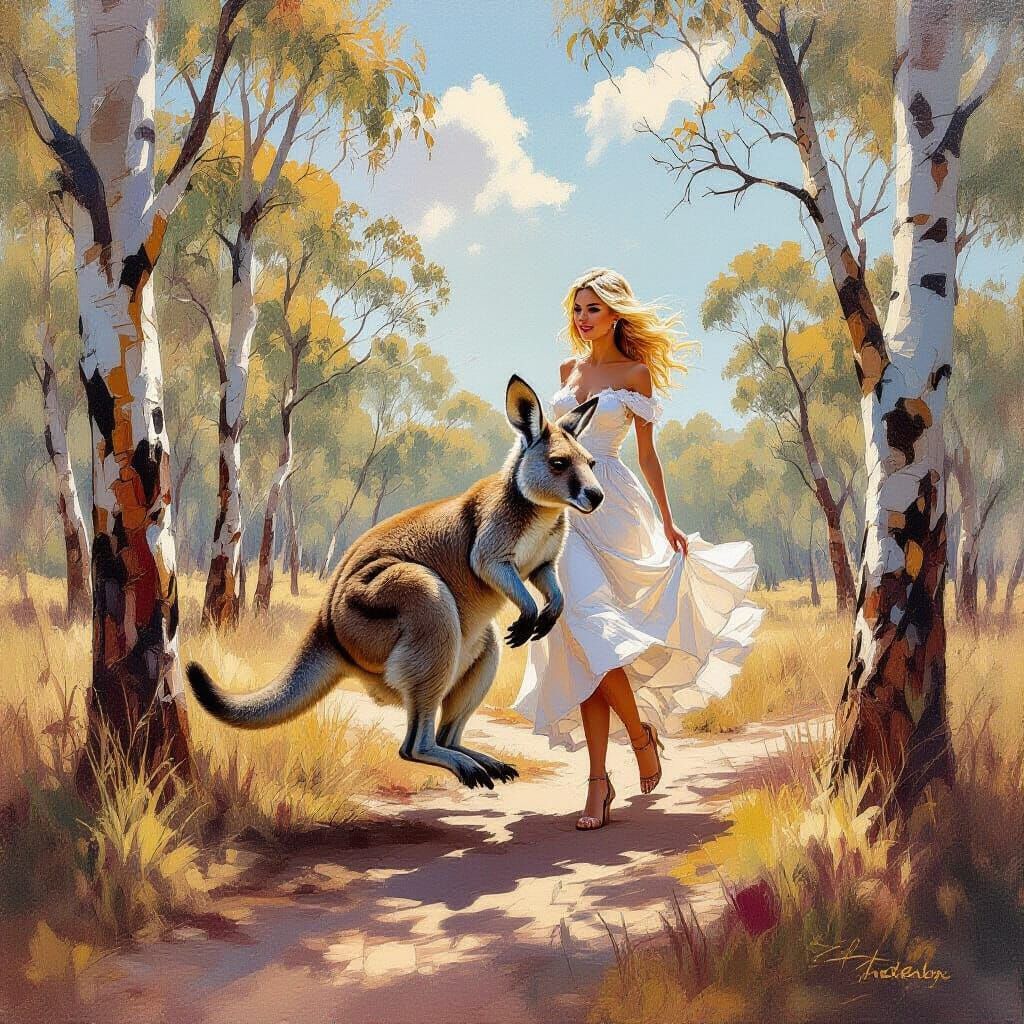 This artistic image showcases a kangaroo jumping through an Australian field, with a blonde woman subtly present. The scene features complementary colors, intricate details, and dynamic golden light in a painterly abstract style.