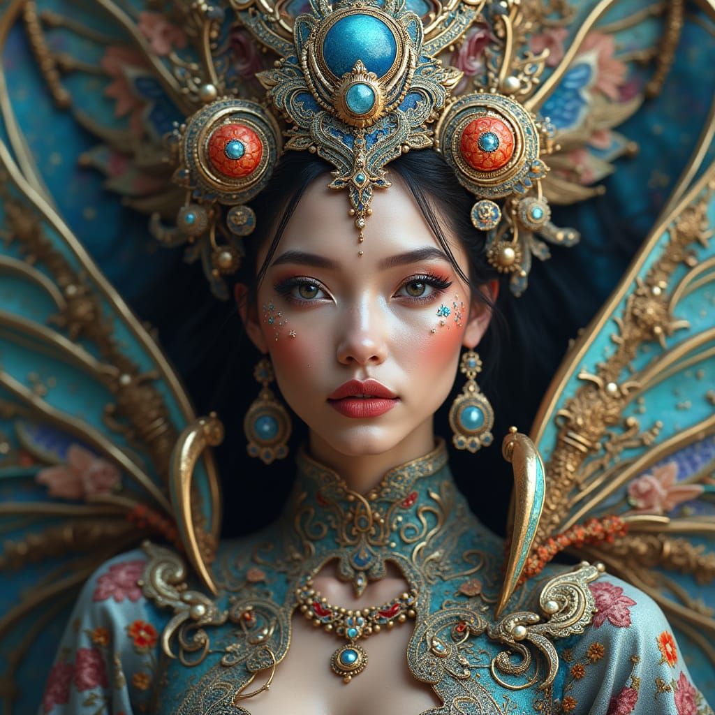 A stunning, hyper-realistic portrait of a woman adorned in intricate, colorful clothing and shimmering jewelry, set against a richly textured background, reminiscent of fantasy concept art and digital art platforms.