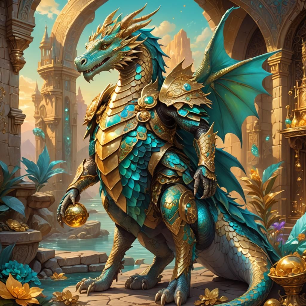 A vibrant digital painting of a former princess transformed into an anthro dragon. She stands surrounded by golden treasure, her iridescent scales shimmering in the mystical light. She is adorned with golden armor.
