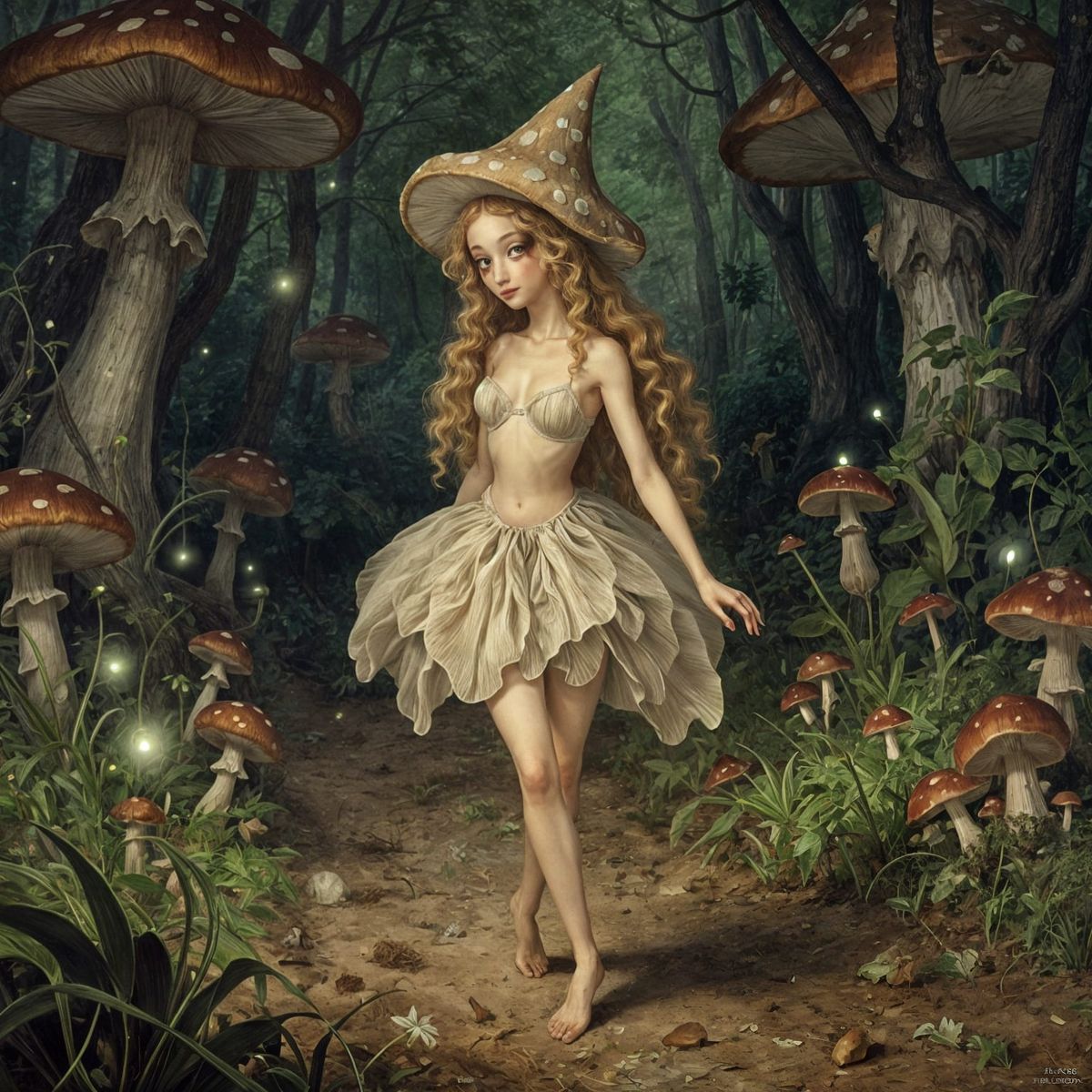 A full-body illustration of a delicate mushroom fairy with pale skin and a coy, enigmatic smile. She wears a medieval mushroom cap hood and her torso transitions into a tutu.