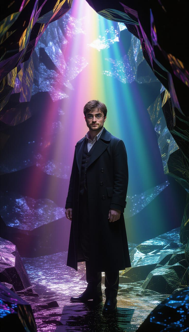 A vibrant image of a figure in a quartz cave bathed in colorful light. The scene features cinematic lighting, film grain, and detailed textures, all rendered with a striking purple and yellow color scheme in a fantasy art style.