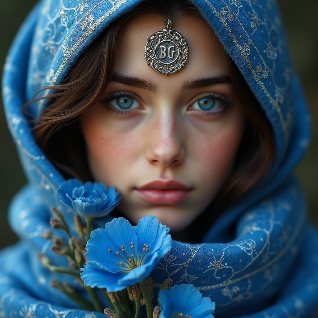 Envolta em mantos azuis de padrões orientais, uma jovem de olhos claros flores seguras da mesma cor. Sua expressão é suave, quase etérea, enquanto joias discretas brilham sob a luz difusa. Entre os fios do véu bordado, escondido como um segredo, um pequeno medalhão antigo traz a inscrição “BG”. A composição ...