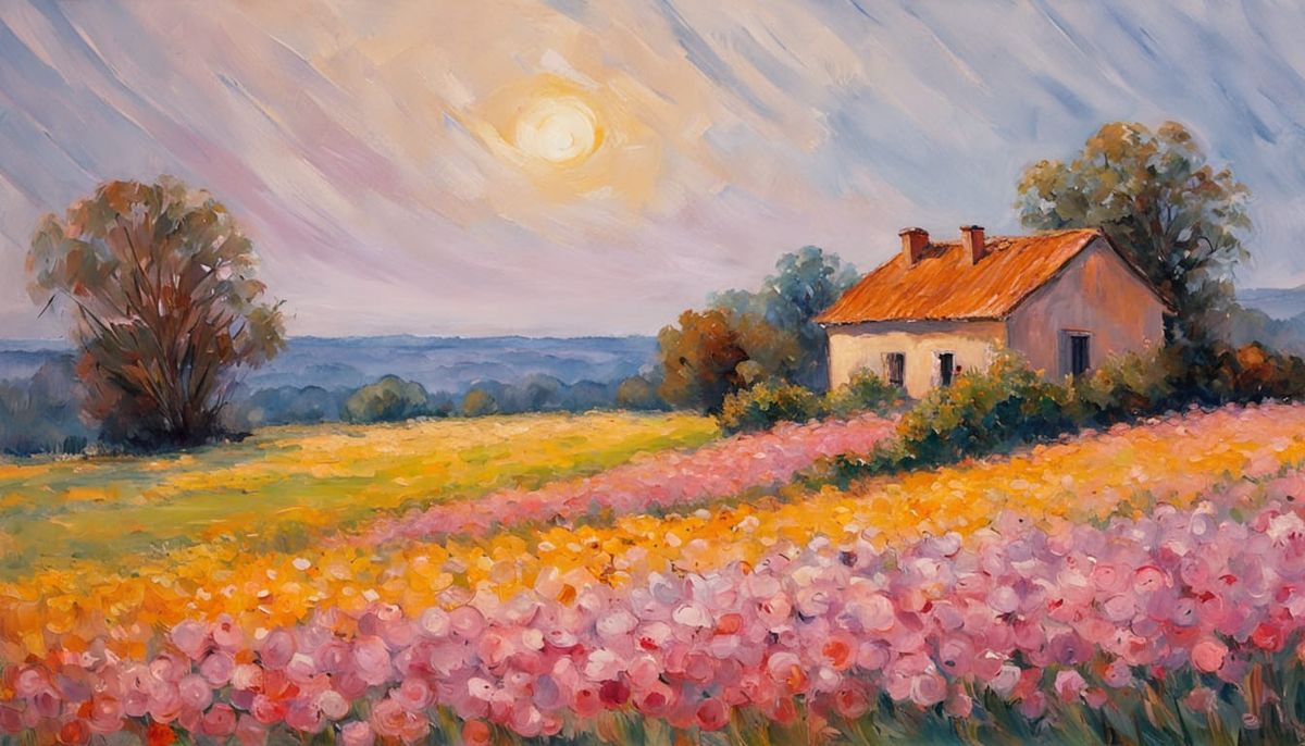 This impressionist painting captures a serene farmhouse at sunrise, with golden rays illuminating rolling hills and wildflowers. Soft pastel colors blend with vibrant natural hues for an ethereal glow.