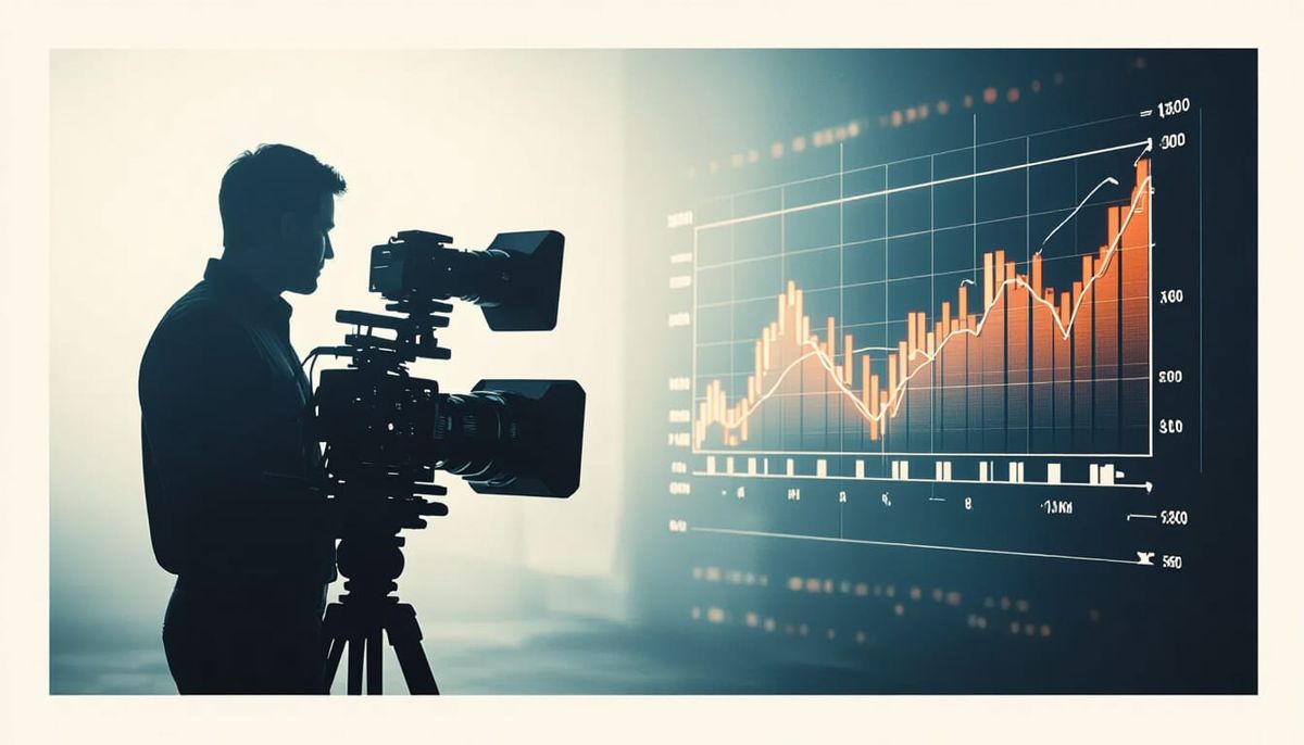 This image shows a business chart with a graph. Presented as a cinematic film still, it features film grain, vignette, and dramatic, atmospheric lighting to enhance the visual impact.