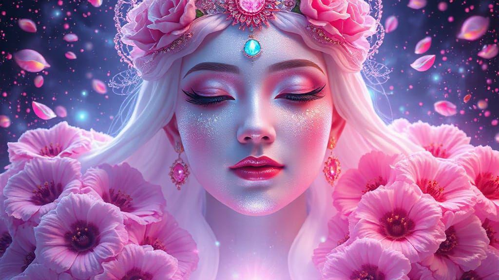 This 8k holographic illustration captures a goddess closeup amidst a vibrant floral display, created with mixed media inspired by Pablo Amaringo's style.