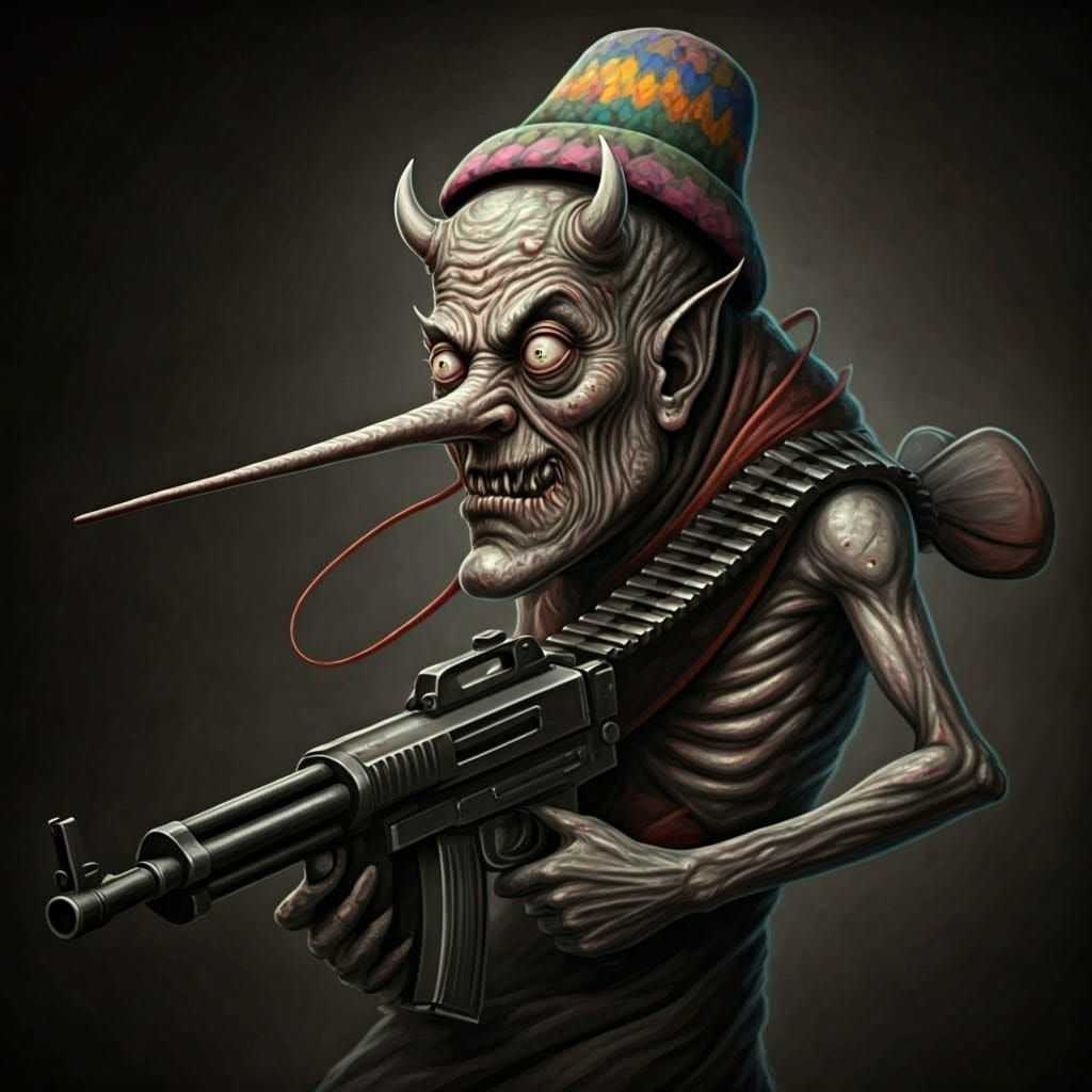 This haunting image features a twisted, nightmarish creature with bulging eyes and a macabre grimace, grasping a machine gun and wearing a vibrant hat, rendered in charcoal with intense shading and textures, evoking dark, visceral terror.