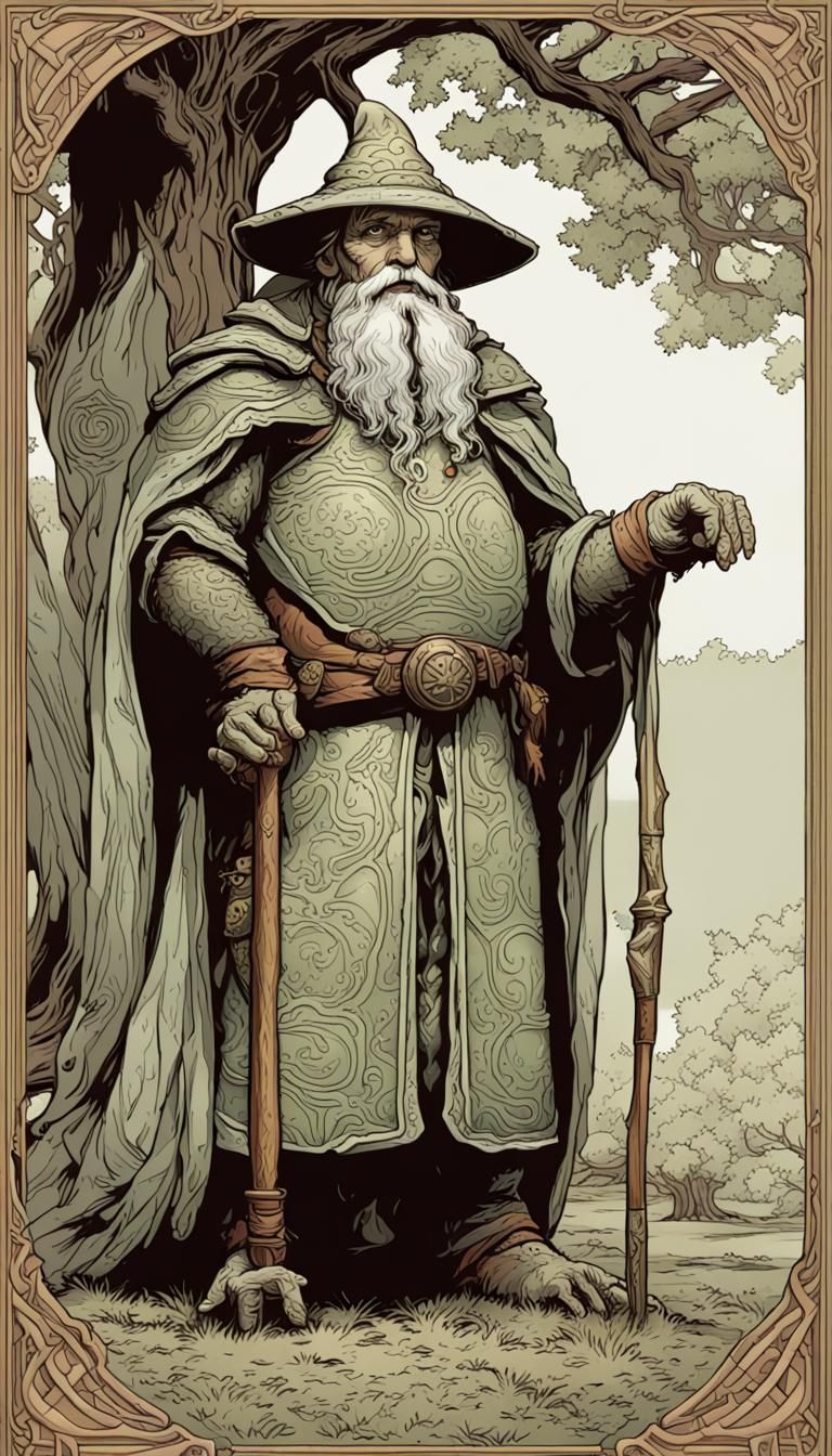 A striking picture of an elderly turtle wizard from Dungeons and Dragons standing beneath an oak tree. This artwork is in an Art Nouveau style, reminiscent of an Alphonse Mucha poster.