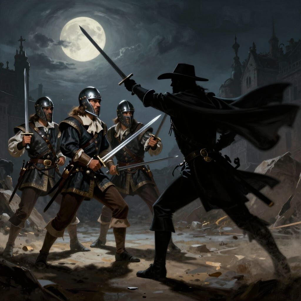 This image shows the four musketeers confronting Zorro in a dynamic, moonlit clash. Rendered in the style of swashbuckling adventure concept art with dramatic lighting.