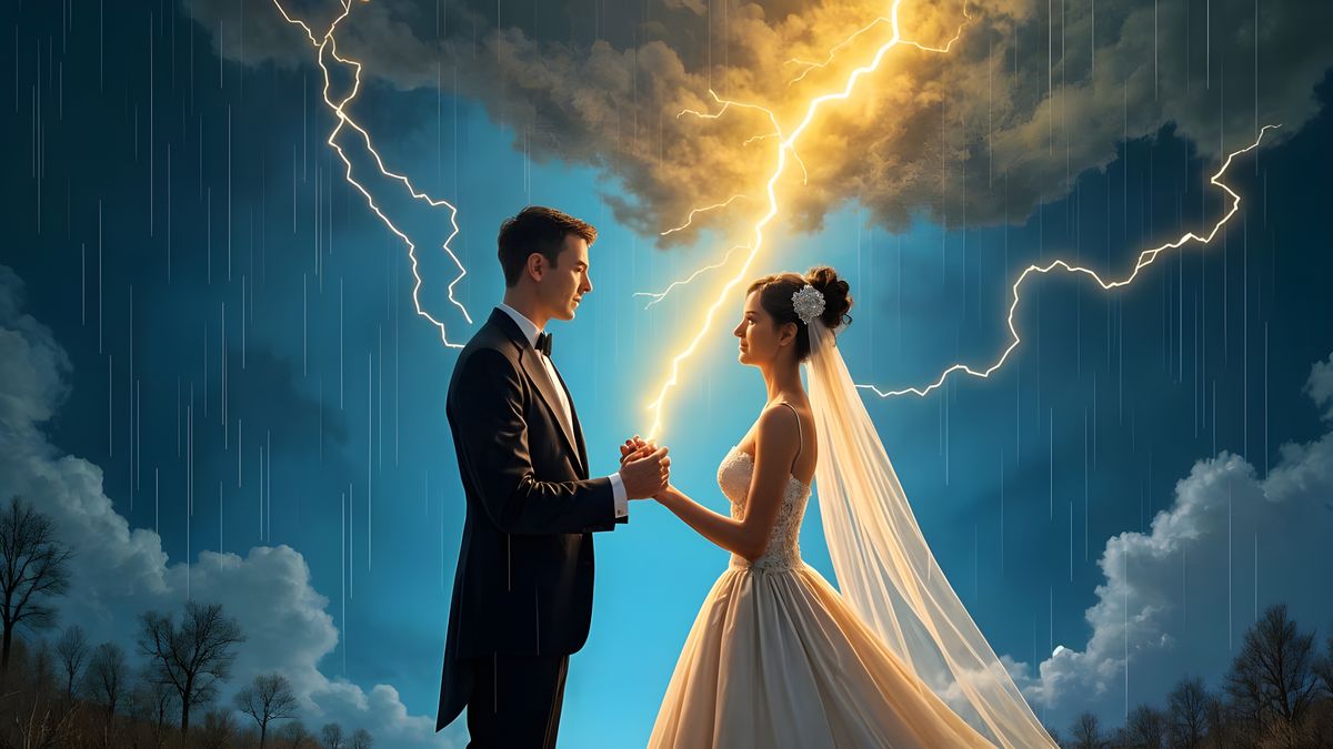 This humorous AI image depicts a lightning bolt marrying a lightning rod, symbolizing an unlikely but fitting union. The artwork captures a playful and surreal concept.