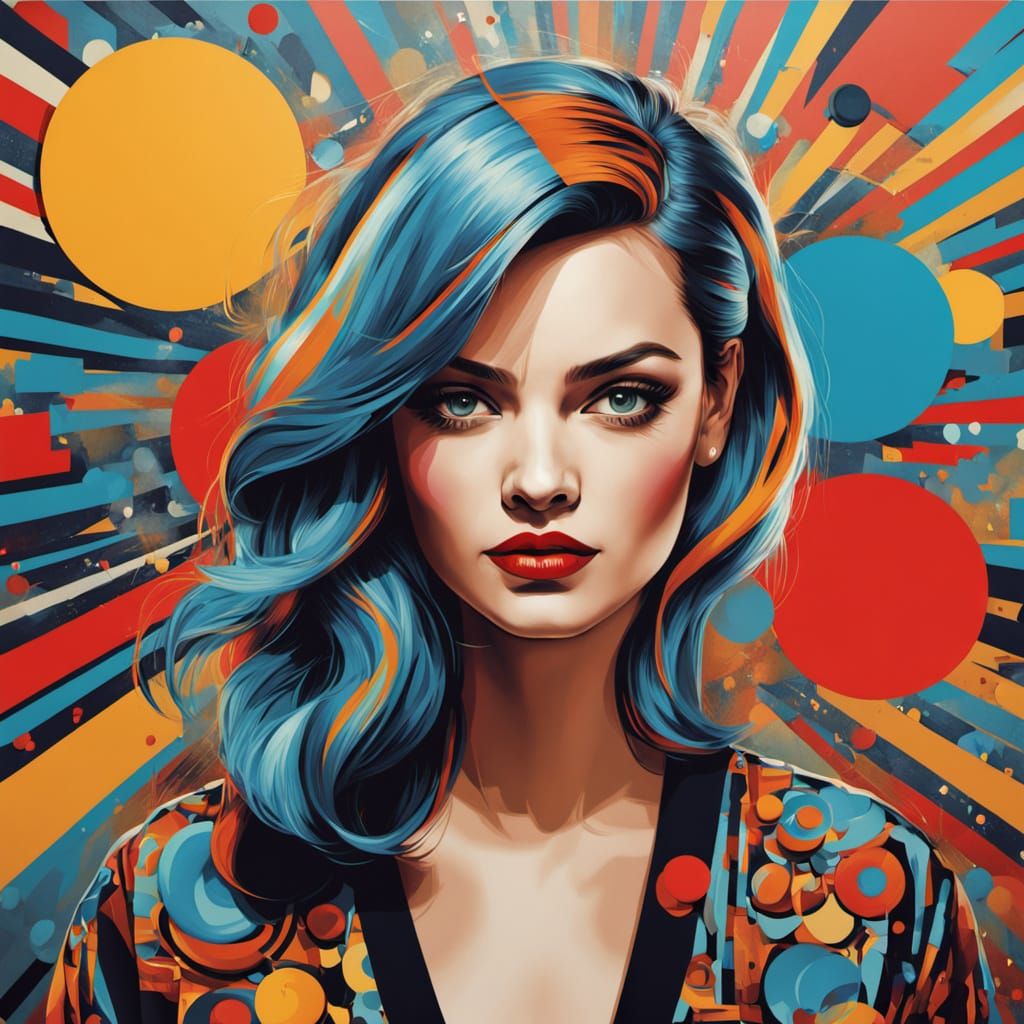 A vibrant pop art style portrait of a modern pin-up with colorful hair, bold makeup, and a retro-inspired dress. The image features dynamic lighting, geometric patterns and vivid colors.