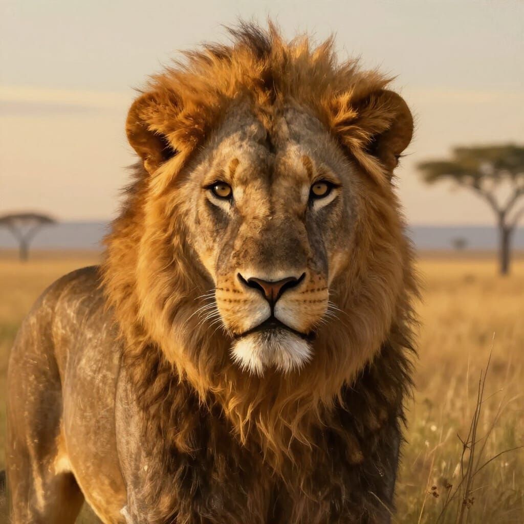 This image shows a hyperrealistic digital painting of a proud lion on a savanna during golden hour. It features dramatic lighting, rich earthy tones, and intricate details.
