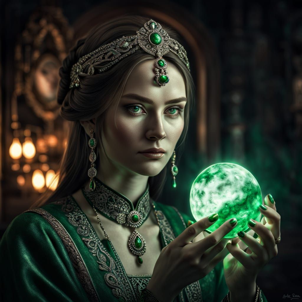 This image showcases a stunning, hyperrealistic portrait of a young Russian woman holding a glowing jade stone. The high-contrast, cinematic quality and intricate details make for a breathtaking visual experience.