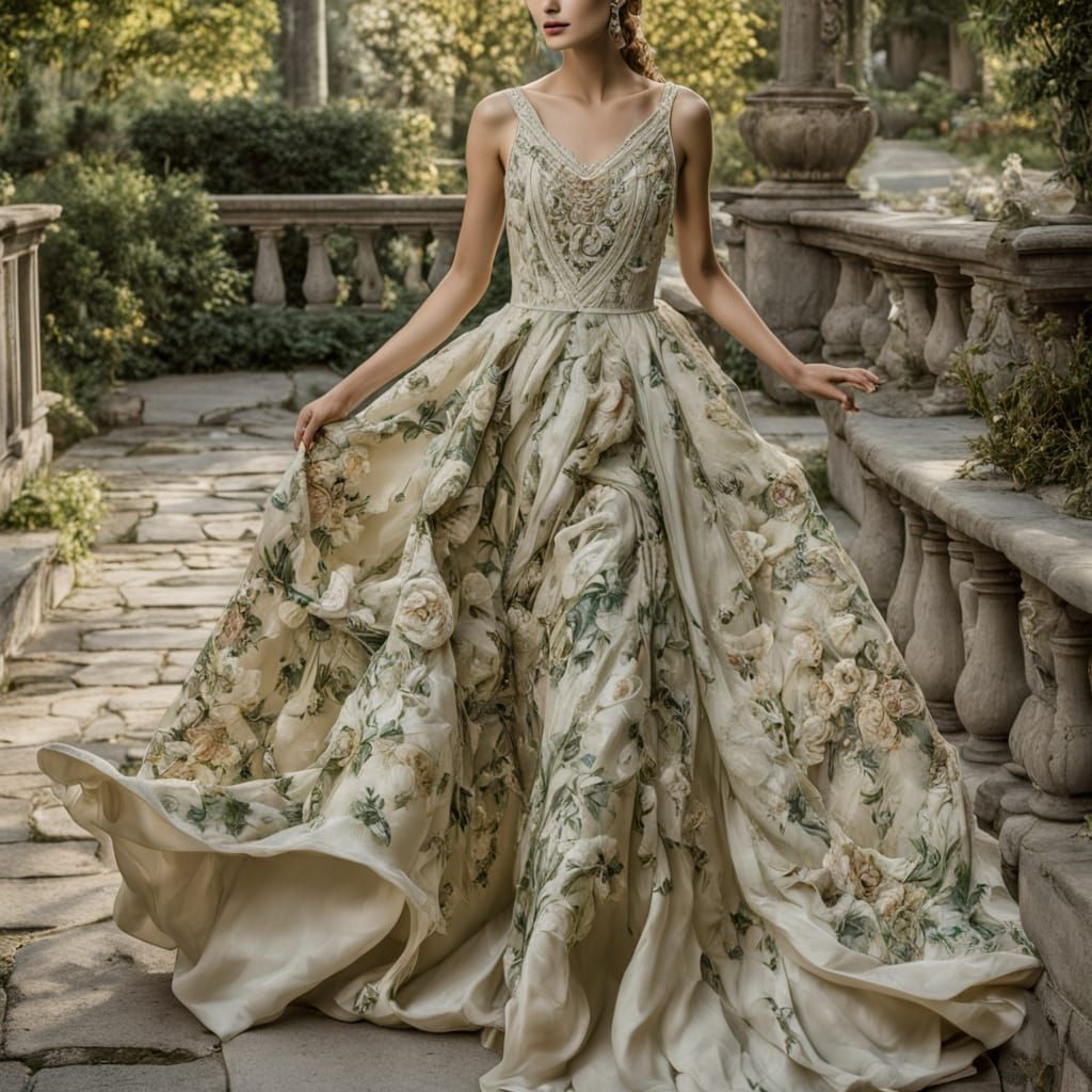 This image shows a serene Victorian woman cycling through a vibrant garden, surrounded by emerald greenery and ornate fountains. Her elegant gown and ornate hat are perfectly captured in this scene, which combines tranquility and dynamic energy.