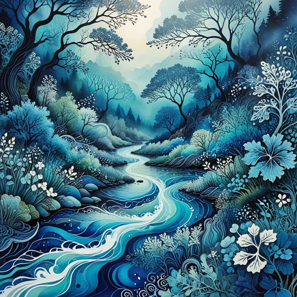 A dreamy image of a cool blue river flowing through a detailed landscape. The artwork features intricate, swirling patterns in an alcohol-ink style with soft mist and a pastel palette.