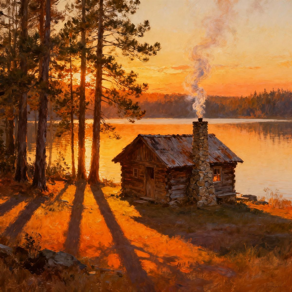 This atmospheric image shows a cozy cabin by a lake as the sun sets. Warm light and long shadows create a painterly, serene landscape.