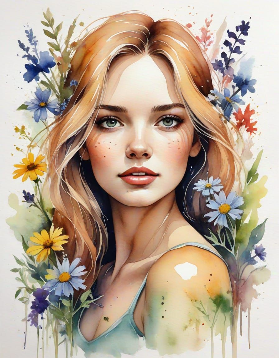 A watercolor painting of a woman adorned with wildflowers. The artwork captures a blend of delicate floral elements and soft, flowing watercolor textures.