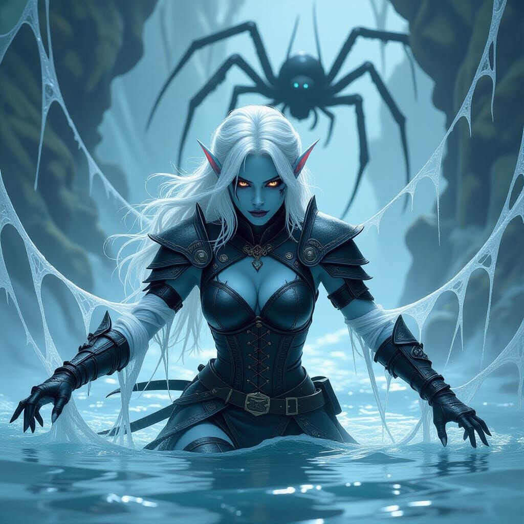 A striking picture of a dark elf warrior woman emerging from a glowing, misty web. She wears ornate leather armor and has vibrant white hair, in a gothic fantasy style.