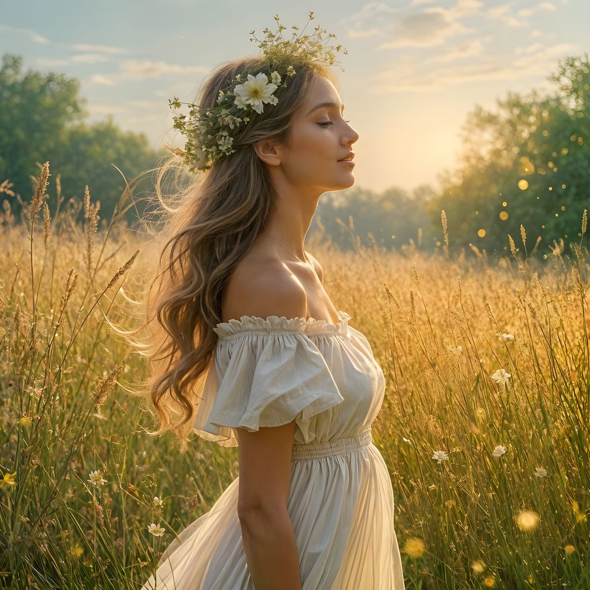 A dreamy image shows a woman with flowers in her hair, standing in a field at twilight. Fireflies illuminate the scene, capturing a peaceful, impressionistic moment.