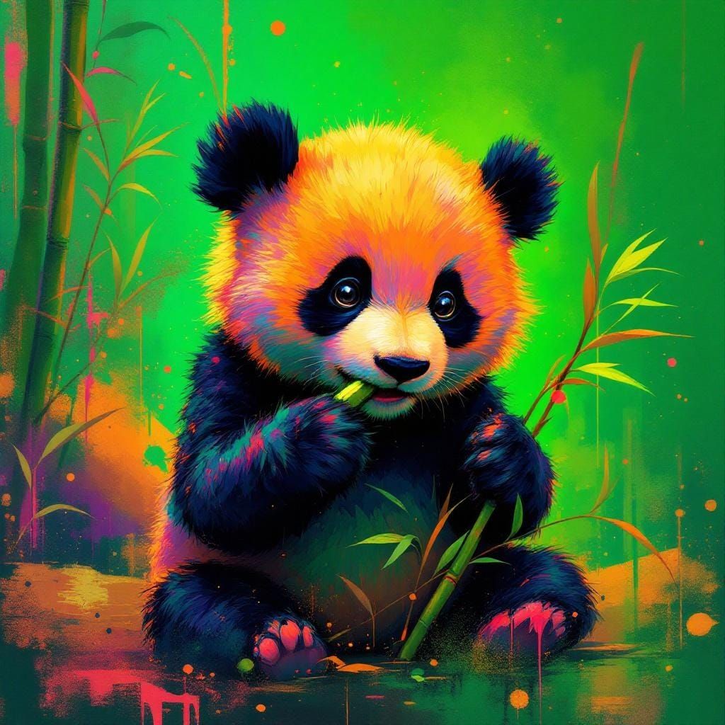 This image shows an adorable baby panda bear eating bamboo. The artwork is rendered in vibrant neon green and orange hues, with a dynamic graffiti art style, and polychromatic colors.