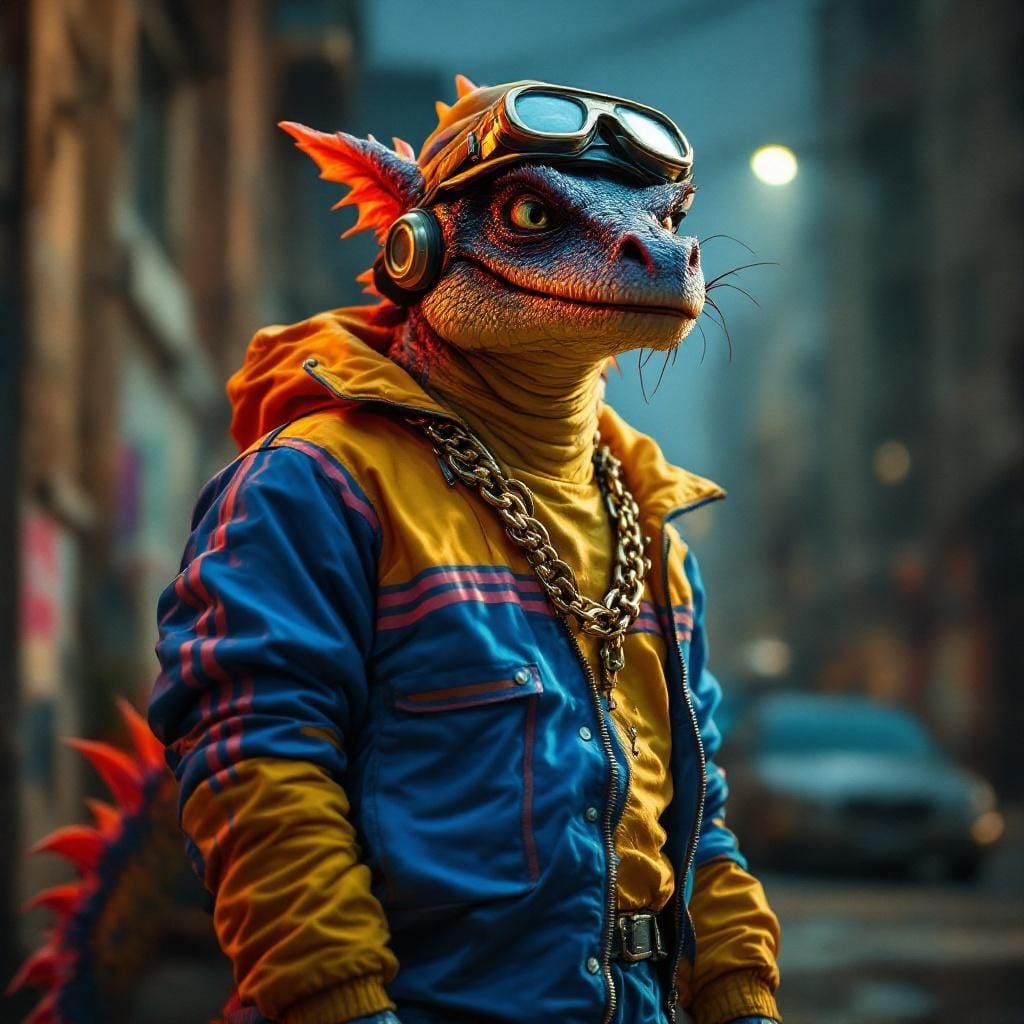 This image shows a heroic kobold dragon wearing a vibrant track suit, bucket hat, gold chain, and welding goggles. The image is infused with film grain and cinematic lighting for a live-action feel.