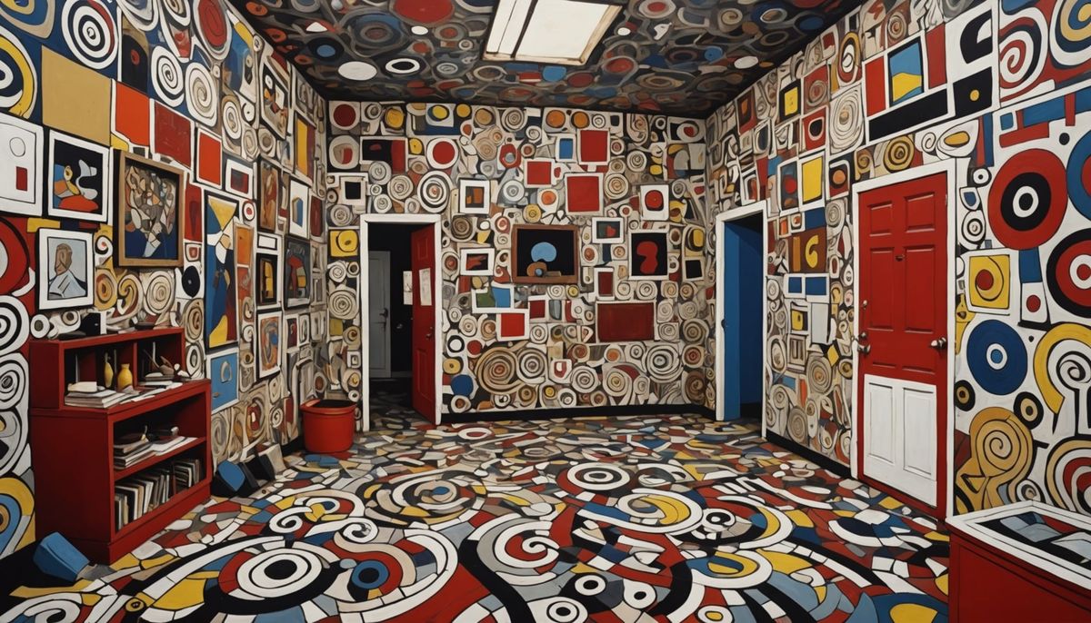 This image shows a chaotic room filled with raw textures and primitive art. Overlapping projections cover the walls, which are painted with spirals and fragmented words, creating a sense of sensory overload.