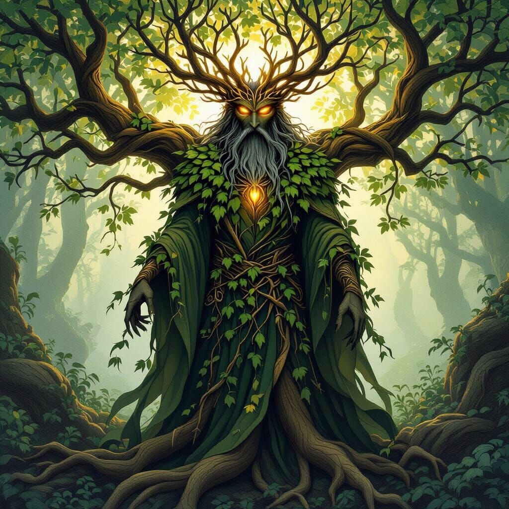 A striking picture of a tree spirit guarding an ancient forest. The figure wears a crown of branches and robes of leaves, rendered with warm earthy colors and art nouveau elegance.