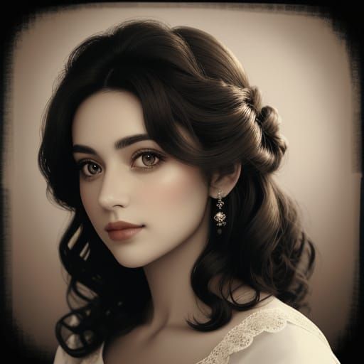 This is a low-key studio portrait of a woman with dark hair in an elegant updo. Captured in a vintage photography style with soft focus and sepia lighting.