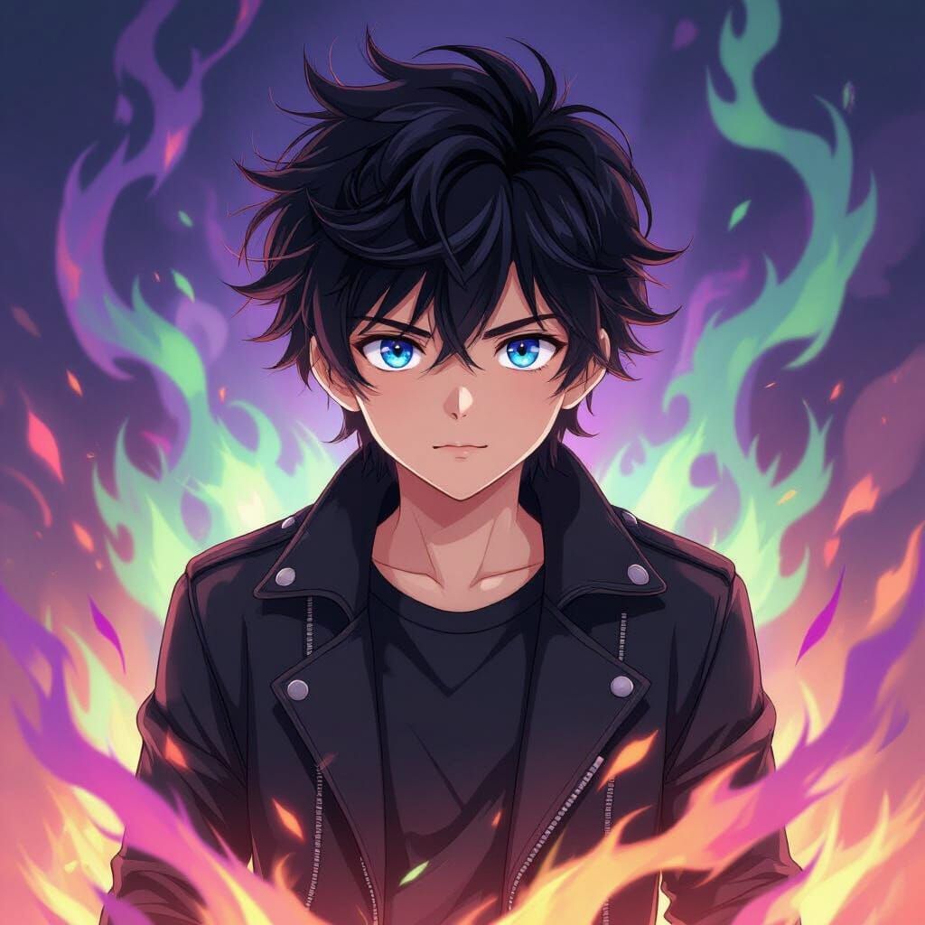 This image shows a handsome boy with black hair and blue eyes, wearing a black jacket. Swirling purple and green flames surround him in a dynamic anime style.
