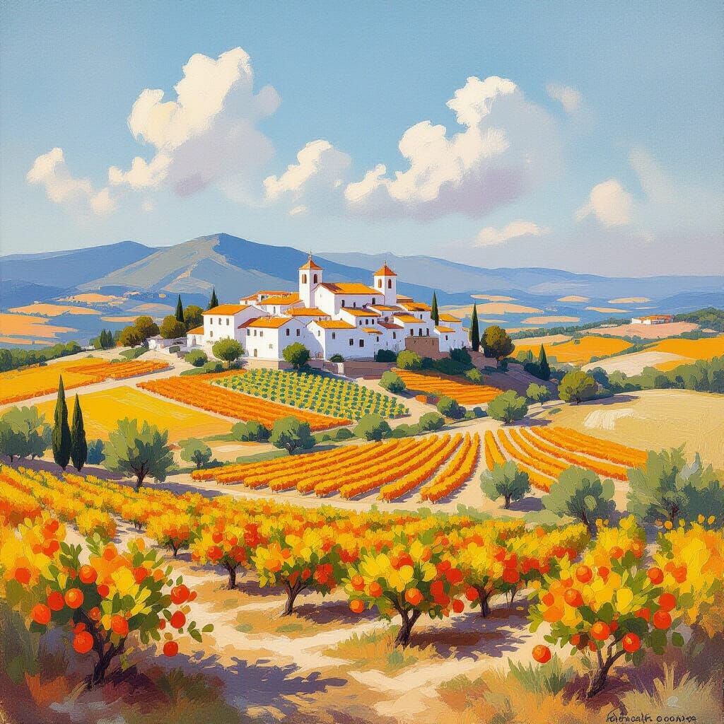 A tranquil landscape featuring rolling hills, vibrant orange groves, and whitewashed villages. The scene evokes a sunny, impressionistic aesthetic.