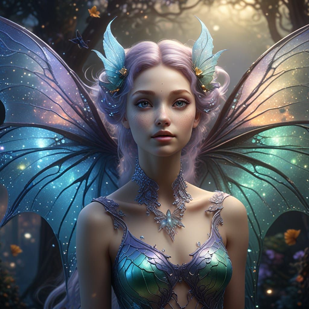 A mesmerizing close-up of a hybrid lunar moth, mermaid, and bat creature. Soft, warm lighting enhances the ethereal fantasy art, with iridescent wings shimmering in a dreamy atmosphere.